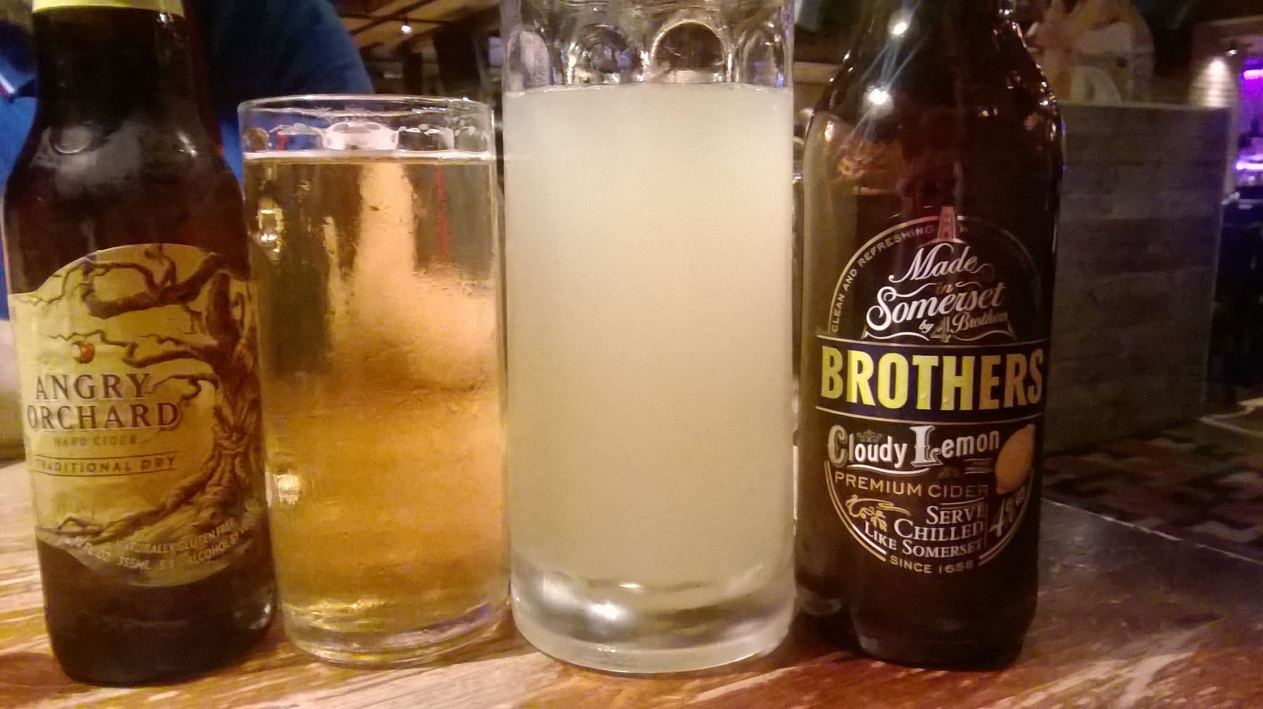 Leffan jälkeen ruuan yhteydessä joimme siideriä; Ummikko M pitäytyi jo tutuissa ja valitsi Yhdysvaltalaisen Angry Orchard -siiderin, jota olimme aikaisemmin verranneet Etelä-Afrikasta kotoisin olevaan Savanna Dry’hin, mutta nyt mieleen tuli paljon enemmän markettisiideri Magners melkein liiallisessa makeudessaan… arvelimme että edelliskokeilusta ei ainoastaan etiketti ole muuttunut, vaan myös resepti, eikä muutos ole parannusta entiseen. Ummikko N valitsi Brother’s Cloudy Lemon Premium Ciderin, jota molemmat pitivät arpapelinä: aikaisemmat Brother’s-siiderit ovat olleet joko ihan hyvä, kuten heidän päärynäsiiderinsä, tai aivan kammottavia kuten heidän toffeeomenansa. Onneksi Cloudy Lemon oli juotava jos ei nyt perin loistava: sitruunalla rankasti maustettu päärynäsiideri näytti lonkerolta ja/tai hard lemonadelta, tuoksui ko. juomilta, ja oikeastaan maistuikin ko. juomilta tai lonkeron ja spriten sekoitukselta jossa oli kevyen kevyttä päärynämäisyyttä. Vaikea juomaa oli siideriksi mieltää, vahvin mielleyhtymä oli Garage Hard Lemonade.