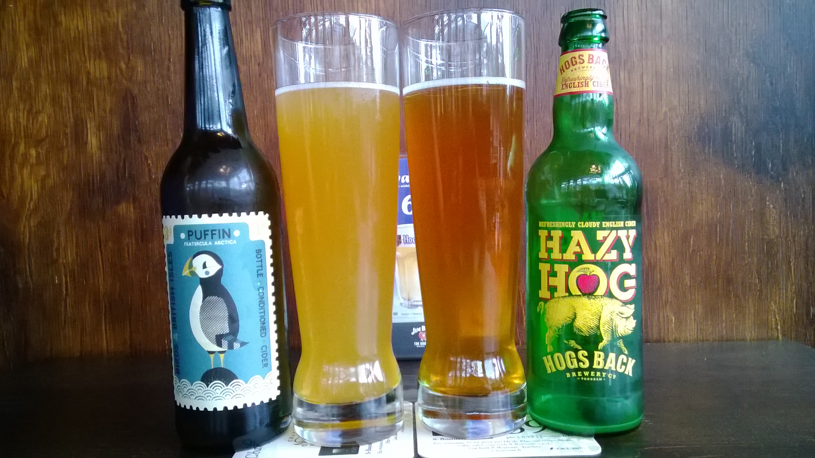 Hazy Hog ei ihan samalle tasolle yllä, mutta hyvä siideri se oli siltikin, etenkin kun ottaa huomioon että se on Hogs Backin ensimmäinen siideriyritelmä. Ulkonäöltään se on tummempi kuin Puffin, ja vaikka samea olikin, niin kuitenkin kirkkaampi kuin kilpakumppaninsa. Tuoksussa oli action-hahmojen kumimaisuutta, He-Man miesten pehmeiden päiden kumintuoksua, sekä makean karamellimaista, hyökkäävää tuoksua. Ei lainkaan hullumpi tuoksu, vaikka hiukan outo olikin. Siiderin pohjana on käytetty Thatchersin siideriä, ja sen kyllä huomaa: kuten toisella isommalla Suomesta saatavalla brittisiiderivalmistaja Westonsilla, on liki kaikissa Thatchersin siidereissä samanlainen perusluonne, jota kutsummekin Thatchers-mauksi; Hazy Hogissa on tätä samaa makua, mikä aiheutti ensialkuun lievää pettymisen fiilistä, mutta toisaalta ymmärrämme miksi uusi tulokas rakentaa siiderinsä menestyneelle pohjalle. Thatcherspohjan päälle Hogs Back rakentaa makeahkoa sameutta, joka on kuitenkin melko hentoa, ja lopputulos on sameudestaan huolimatta helposti juotava ja raikas juoma. Ei mitenkään ikimuistettava, mutta ensimmäiseksi yritelmäksi oikein lupaava.