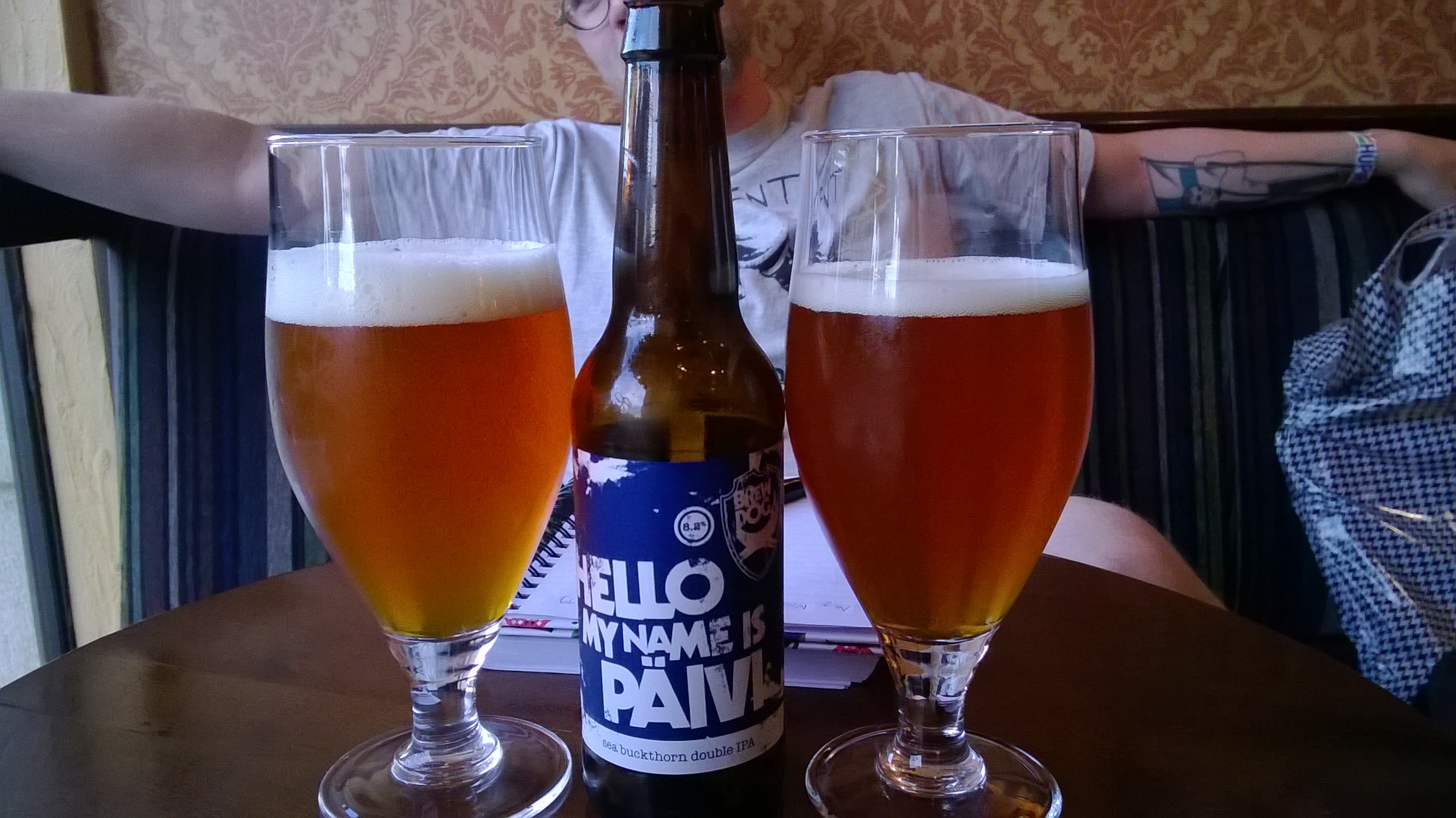 Kolmansia ei ollut tarkoitus ottaa, mutta sitten huomasimme että Pub99:stä saa vielä BrewDogin Hello, My Name Is Päivi -erikoisolutta, joten olihan sitä maistettava. Harmillista että makunystyrät olivat jo hiukan tylsistyneet tässä vaiheessa, olisi nimittäin ollut mukava paneutua Päiviin ihan kunnolla tämmöisen melko ylimalkaisen ja pikaisen perehtymisen sijasta. Fiilis on kuitenkin että Päivi on Punk IPA:sta jatkokehitelty tuote, ja siinä on paljon samaa kuin suositussa punkkarissa, vaikka tyrnimarja tuo siihen tiettyä karuutta, kallioisuutta ja kalseutta. Siinä missä Punk IPA on auringonpaiste havumetsässä, on Päivi meren rantakallioihin lyövä tyrsky. Punk IPA on kalastaja tyynellä järvellä, Päivi on keltaiseen sadeasuun sonnustautunut partainen mies meren rannalla. On tietenkin mahdoton erottaa nimen luomaa mielikuvaa itse mausta, mutta vaikkei tyrni mullista makua, tuntuu se tuovan tiettyä suomalaista karuutta juomaan, mikä ei ole lainkaan hullumpi muunnelma. Kuitenkin on pakko todeta että juomaan liitetty hype on hivenen liioiteltua, eikä itse juoma ole kaiken buustauksen veroinen, vaikka ihan hyvä onkin.
