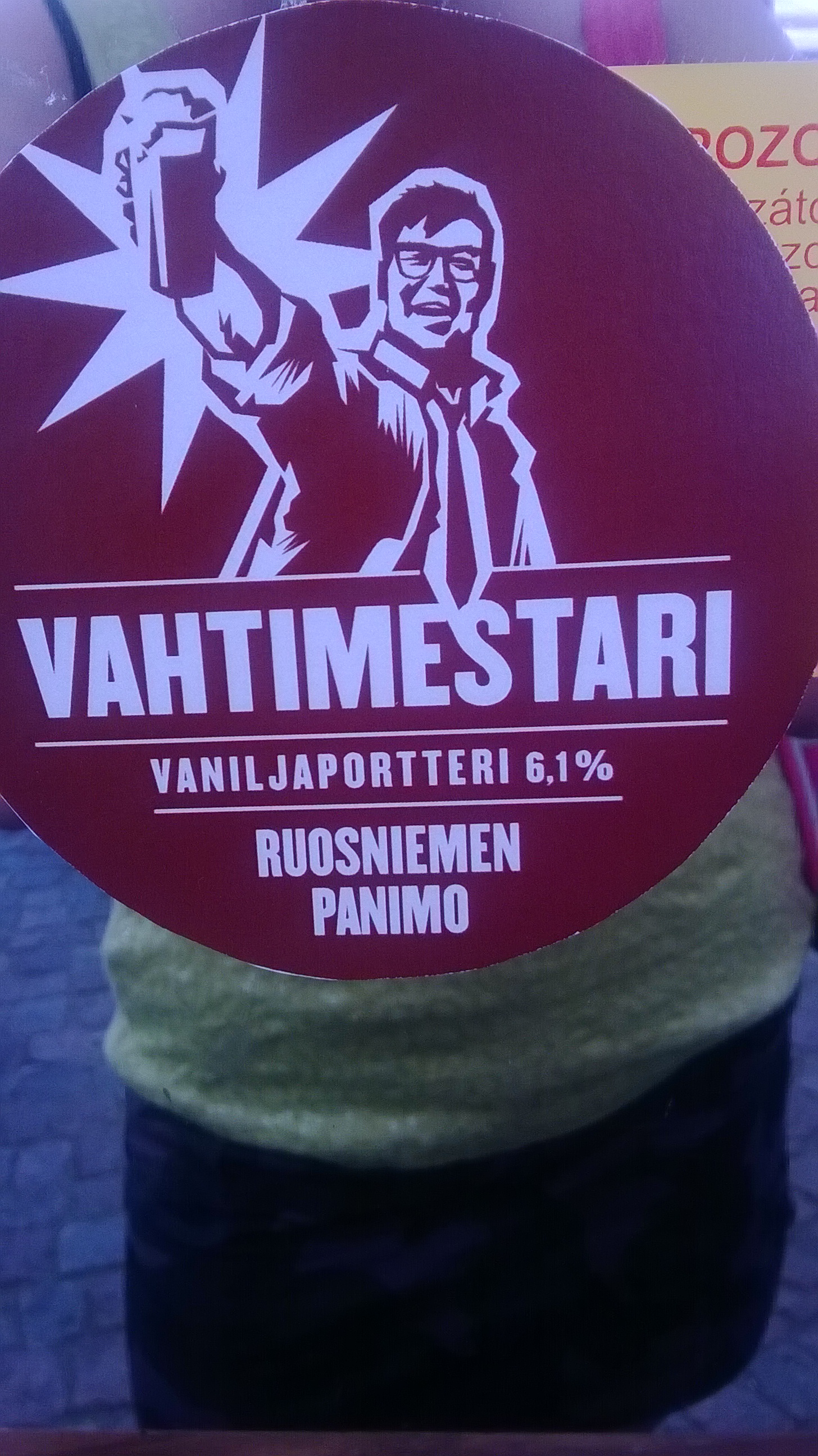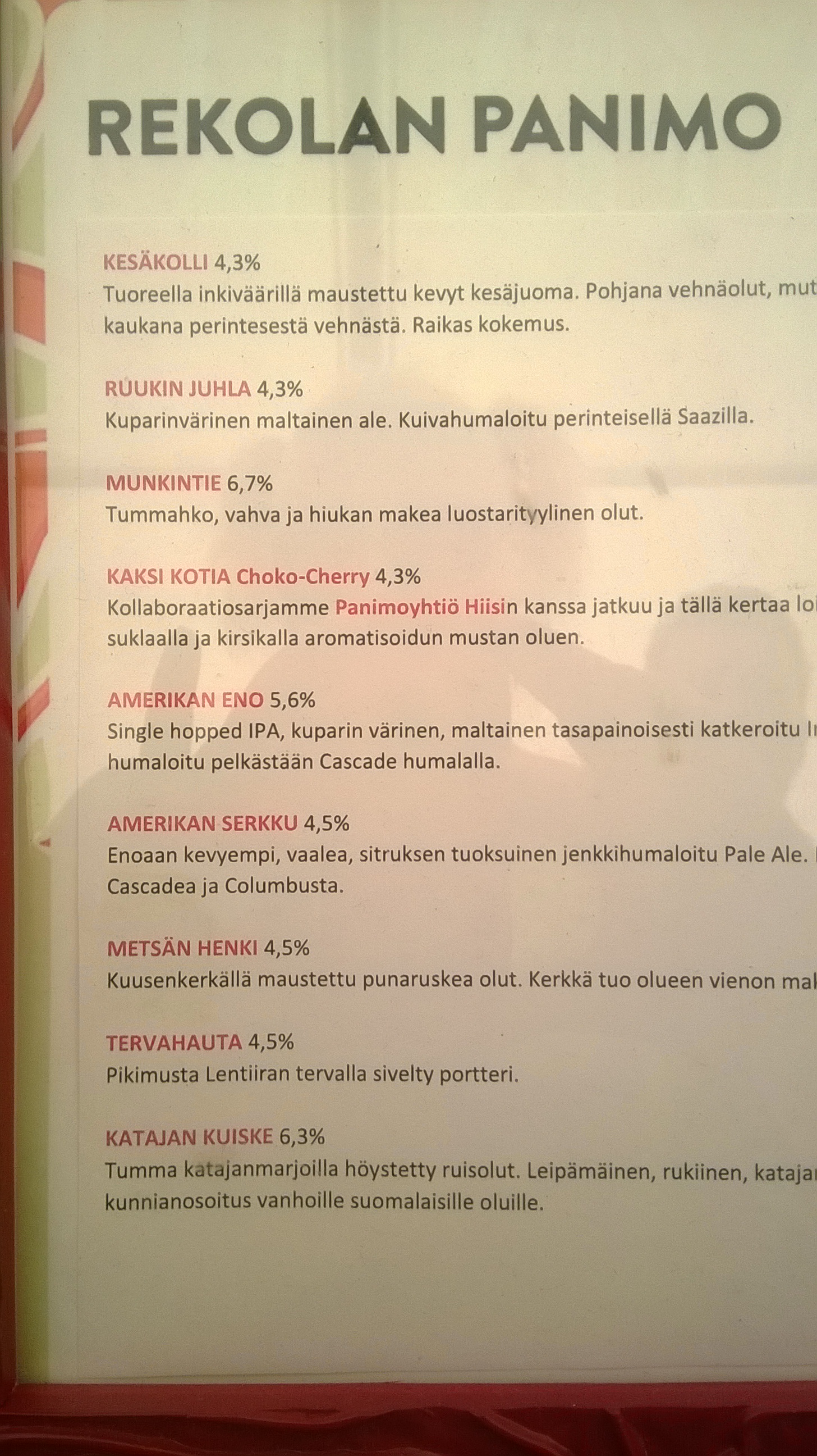 Etukäteen olimme hiukan ylimalkaisesti tutustuneet eri panimoiden tarjontaan, ja muutama pakkomaisteltava oli kirjattu ylös, sekä mielenkiintoisimmat panimot, ja näitä muistiinpanoja käyttäen suunnistimme alueella pisteestä pisteeseen. Etukäteen olimme myöskin sopineet että nautimme ainoastaan viisi maistelukokoista annosta per lärvi, jottei mene kännin puolelle ja maistelu mene hukkaan. Aika hyvin tämä pitikin, sillä loppujen lopuksi joimme kumpikin kuusi annosta alueella. Ensimmäinen pysähdys oli Rekolan Panimon kohdalla, jonka Kaksi Kotia Choco-Cherry oli yksi ehdottomista testattavista. Toiseen tuoppiin juomauhriksi Ukolle joutui Tervahauta-porter. Ikävä kyllä molempia vaivasi vetisyys, Kahta Kotia enemmän kuin Tervahautaa. Muuten Kaksi Kotia oli aika mielenkiintoinen, tuoksussa tuntui pikemminkin marjaisuus kuin varsinainen kirsikka, mutta maussa marjaisuuden tunnisti nimenomaan kirsikaksi, joka toimi hyvin yhdessä suklaan kanssa. Ikävä kyllä vetisyys kampittaa Kahta Kotia liikaa jotta se voisi todella loistaa. Tervahaudassa tuoksuu nimen terva suklaan ja kahvin ohella, ja terva antaa hiukan savuistakin luonnetta sekä tuoksulle että maulle, jossa on paljon portereille ominaista makua. Ikävä kyllä Tervahautakin kompastui vetisyyteen. Ei kuitenkaan hullumpi aloitus soppailukierrokselle.