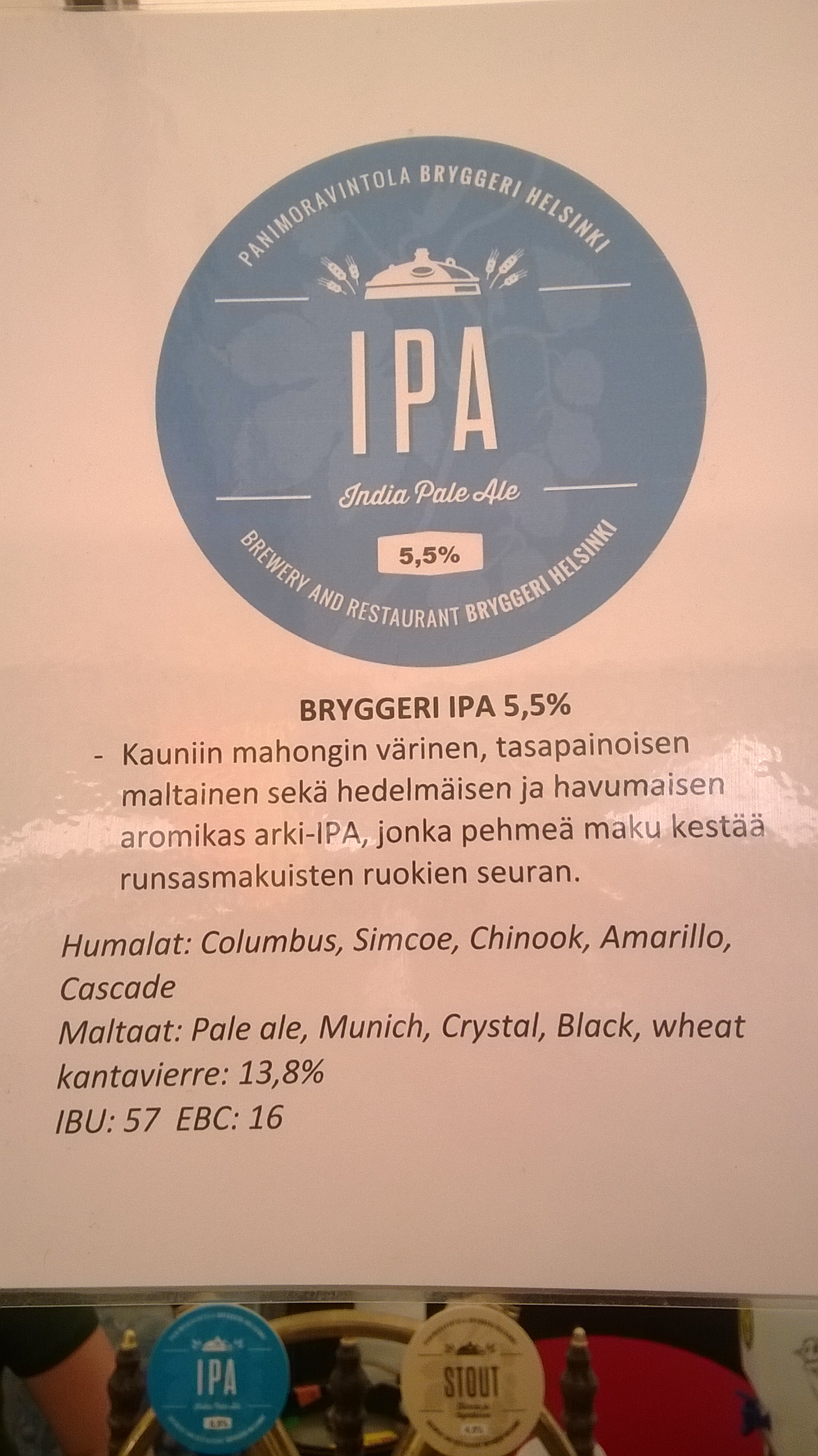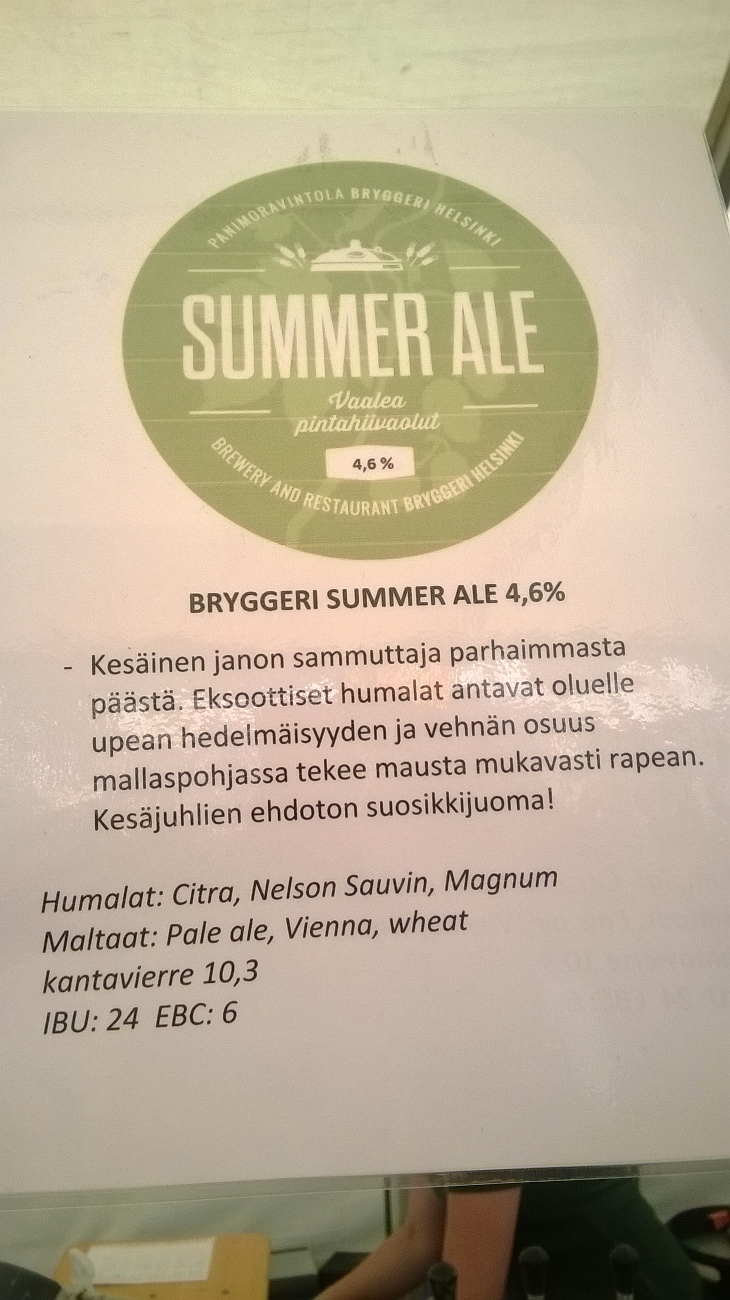 Aurinko posotteli taivaalla kuin mikäkin omahyväinen tulipallo, joten tuntui siltä että nyt olisi aika siirtyä synkkyydestä valoon, eli tummat oluet hetkeksi tauolle. Panimoravintola Bryggeri tarjosi vastauksen IPA:llaan ja Summer Alellaan. Molemmat olivat humalapainotteisia ja hedelmäisiä, ja niiden välillä olikin havaittavissa sellainen sukulaisuus, että vaikkemme olisi tietäneet, olisimme kenties osanneet arvata että ovat saman panimon tuotteita. Summer Alessa olikin paljon samaa IPA-oluiden kanssa, humalapainotteisuudesta ja sitrusmaisesta mausta lähtien, mutta juomaa loivensi trooppinen hedelmäisyys, joka teki Summer Alesta melko kevyen, virkistävän, raikkaan ja nimensä veroisen. IPA, ehkä hiukan yllättäen, oli tuoksultaan vähemmän humalainen, ja muutenkin juoma oli IPA:ksi hyvällä tavalla mieto, keskittyen virkistävyyteen humala-OD:n sijasta. Molemmat olivat oikein mieluisia uusia tuttavuuksia, ja näiden ansiosta Bryggeri taisikin nousta tämänvuotisen SOPP:in kärkinimeksi meidän listallamme.
