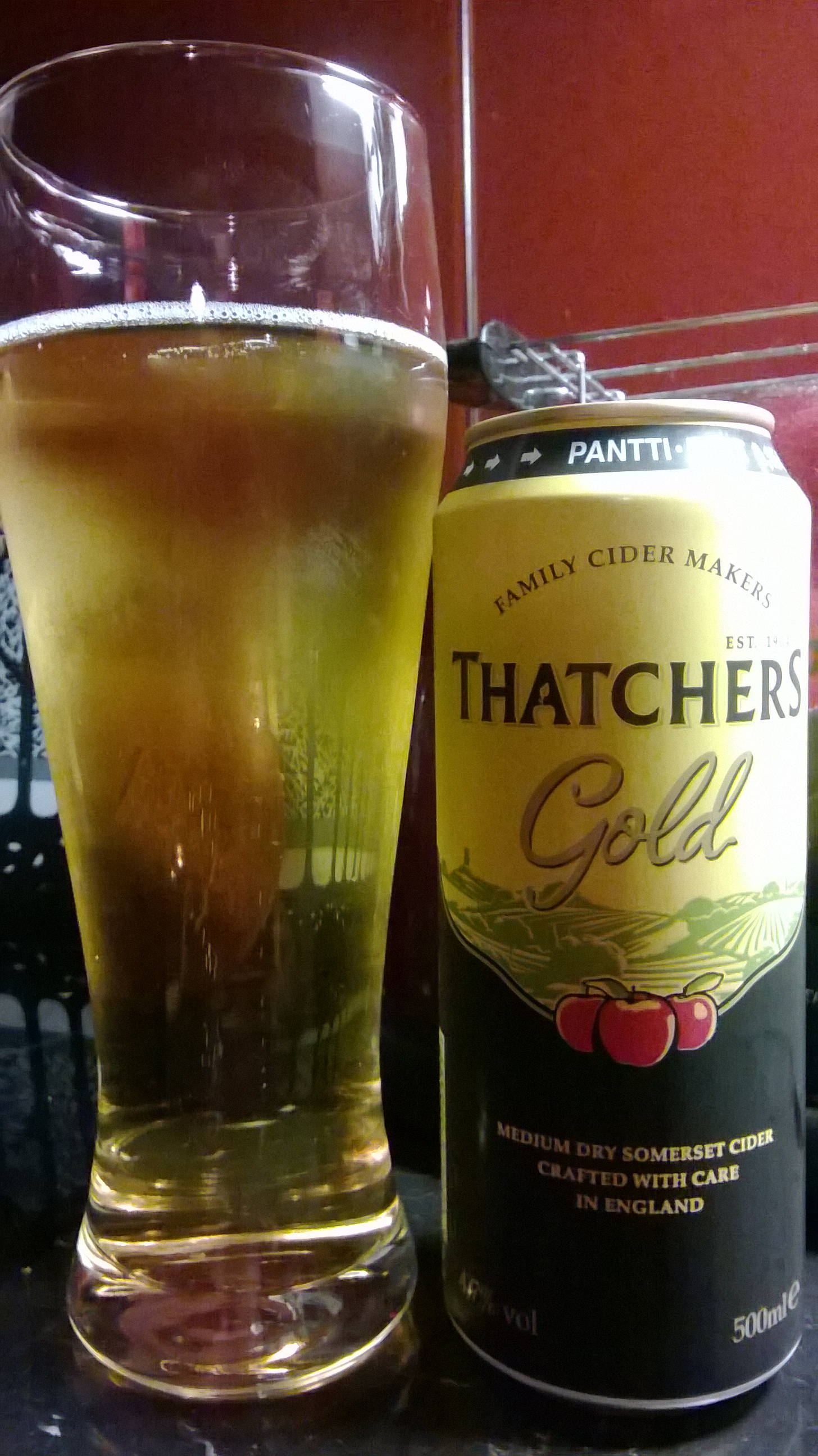 Thatchers Gold, jota saa useimmiten S-ryhmän kaupoista, on väriltään ja olemukseltaan kalpean keltainen, hiukan nimensä kultaan vivahtava, runsaan hapokas, erittäin kirkas ja suodatetun oloinen. Se vaahtoaa kovalla äänellä kuin mikäkin limu, ja vaahto katoaa heti jättäen runsaasti poreilevan kirkkaan juoman lasiin ihan yksinään ilman kavereita. Ellei erehdy laittamaan jäätä siiderilasiin, jolloin voikin meidän puolestamma mennä kotiin häpeämään. Tuoksu on kevyt ja hentokin, raikas, omenainen, makea, ja suorastaan huokuu Thatchersin siidereille tyypillistä tuoksua. Ns. Thatchers-tuoksua on vaikea kuvailla sanoin, mutta se on ehkä aavistuksen hunajainen tai hunajaisen vahamainen sivujuonne omenan tuoksussa. Esim. S-ryhmän siiderifestareilla olleessa Hogs Backin Hazy Hog -siiderissä, joka oli Thatchersin kanssa yhteistyössä tehty, oli aivan selvästi samaa ominaistuoksua ja -makuakin. Yleisesti ottaen Thatchers Goldin tuoksu on juuri yhtä kasvoton ja luonteeton kuin Thatchers Gold muutenkin, muttei mitenkään vastenmielinen tai huono.