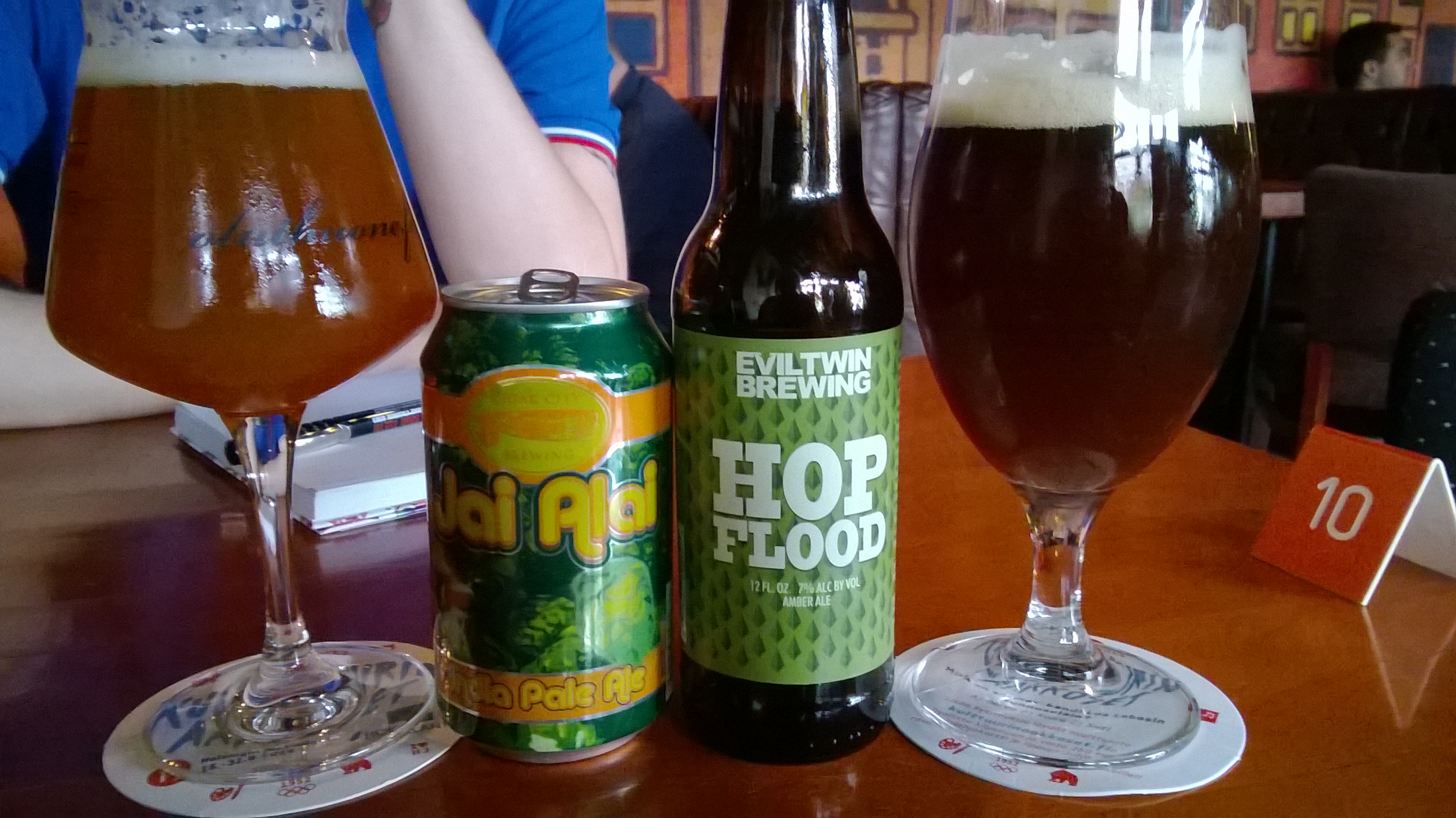 Ensimmäinen pysähdyspaikkamme oli Kampissa sijaitseva Rotterdam, jossa lounaan ohella nautimme muutaman oluen. Ensimmäinen pari oli EvilTwin Brewingin amber ale Hop Flood sekä Cigar City Brewingin Jai Alai -IPA. Hop Flood oli melko tyypillinen amber ale, eli tuoksultaan ja maultaan toi mieleen kotikaljan johon on lisätty reilusti humalaa. Hiukan BrewDog-maiseen tapaan provosoivan humaloitu olut oli kyllä melkoisen kuiva, mutta alla oli kotikaljamaista pehmeyttä. Ajan myötä hapokas, makeahko maltaisuus nousi enemmän esille. Oikeastaan aivan oiva olut! Jai Alai tuli pikemminkin hedelmälimpparin mieleen tuovassa tölkissä, ja melko hedelmäinen IPA olikin kyseessä: melko miedossa tuoksussa oli sekä sitrusta että appelsiinia, ja maussa appelsiinimaista, trooppista ja jopa mangomaista hedelmäisyyttä. Maultaan Jai Alai oli hyvin kevyt, ja korosti hedelmäisyyttä humalan kuivuuden yli, ollen siten sekä raikas että virkistävä. Ehkä aavistuksen outo IPA, mutta ihan hyvä sekin.