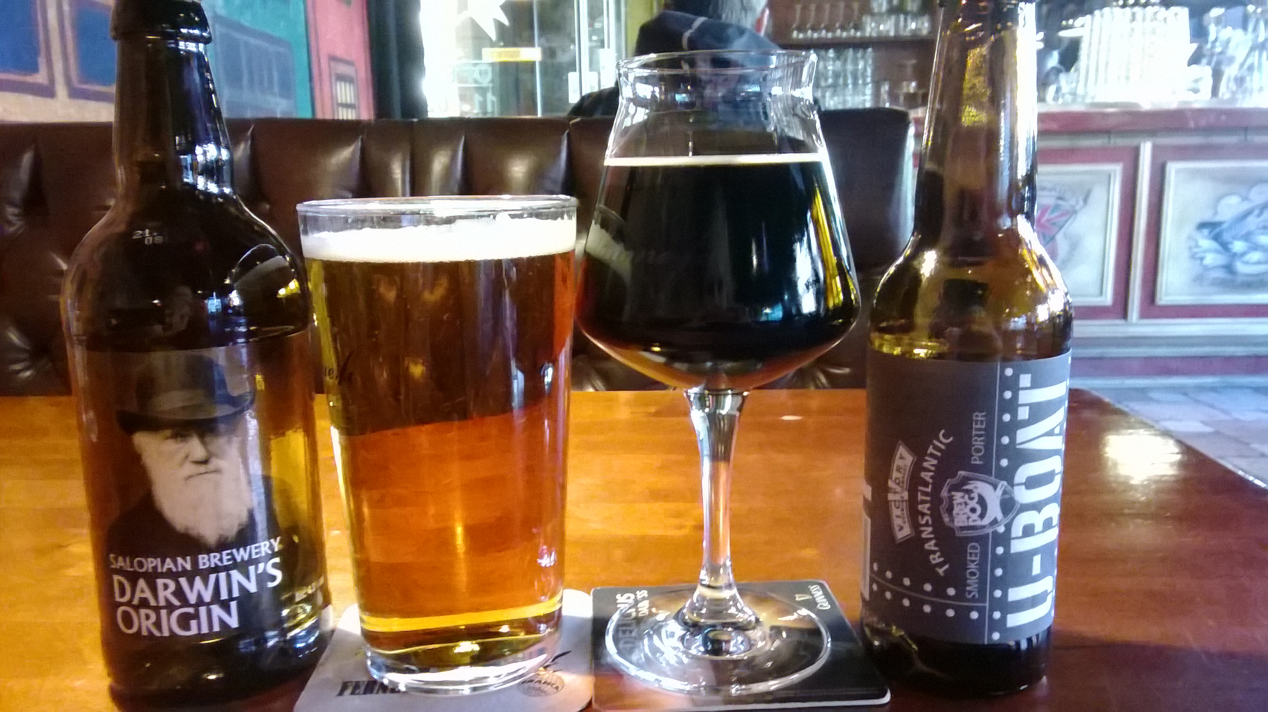 Kuten tapanamme on, lähti Ummikkopariskunta jokakuukautiselle tuuletuskierrokselleen armaan pääkaupunkimme ytimeen, jossa agendalla oli leffa, levyostoksia, päivällinen ja muutama olut. Totuttuun tapaan aloitimme Kampin Rotterdamista pienen muttei kovin kevyen lounaan merkeissä. Ja lounasjuomana toimi totta kai Iso O eli omenalimonadi. Tai siis olut. Ummikko M valitsi sokkona U-Boat -nimisen porterin, joka paljastuikin BrewDogin ja Victory Brewing Co.:n yhteistuotokseksi, eli Atlantin ylittävää tummien vesien kyntöä. Varsin mukavan mämmisen tummasta ja kotikaljamaisesta tuoksusta puuttui savuisuus, jota pulloon kirjoitettu ”smoked porter” lupaili. Maku seurasi samoja askelmerkkejä: tuhti, tumma, hapokas, mutta savuisa ei millään. Muuten varsin hyvä olut, vaikka korkea alkoholiprosentti (10%) tuntuikin, mutta U-Boatissa oli häiritsevä sapekas sivujuonne, joka laski pisteitä; hiukan pehmeämpänä olisi ollut parempi. Ummikko N luotti perinteisempiin aleihin ja otti Salopian Breweryn marketeistakin löytyvän Darwin’s Origin -bitterin. Harmillista kyllä, aivan liiallinen vetisyys latisti hedelmäisen ja tunkkaisen greippisellä tavalla humalaisen tuoksuisen oluen jossa oli miellyttävän katkera ja sitruksinen jälkimaku. Runko vain oli ihan liian heikko, toi mieleen hiukan BrewDogin matala-alkoholisen Nanny Staten. Maussa oli myös aavistus red alemaisuutta. Tukevampana olisi voinut olla todella hyvä ja helppo bitter, mutta tälläisenään oli aivan liian laimea.