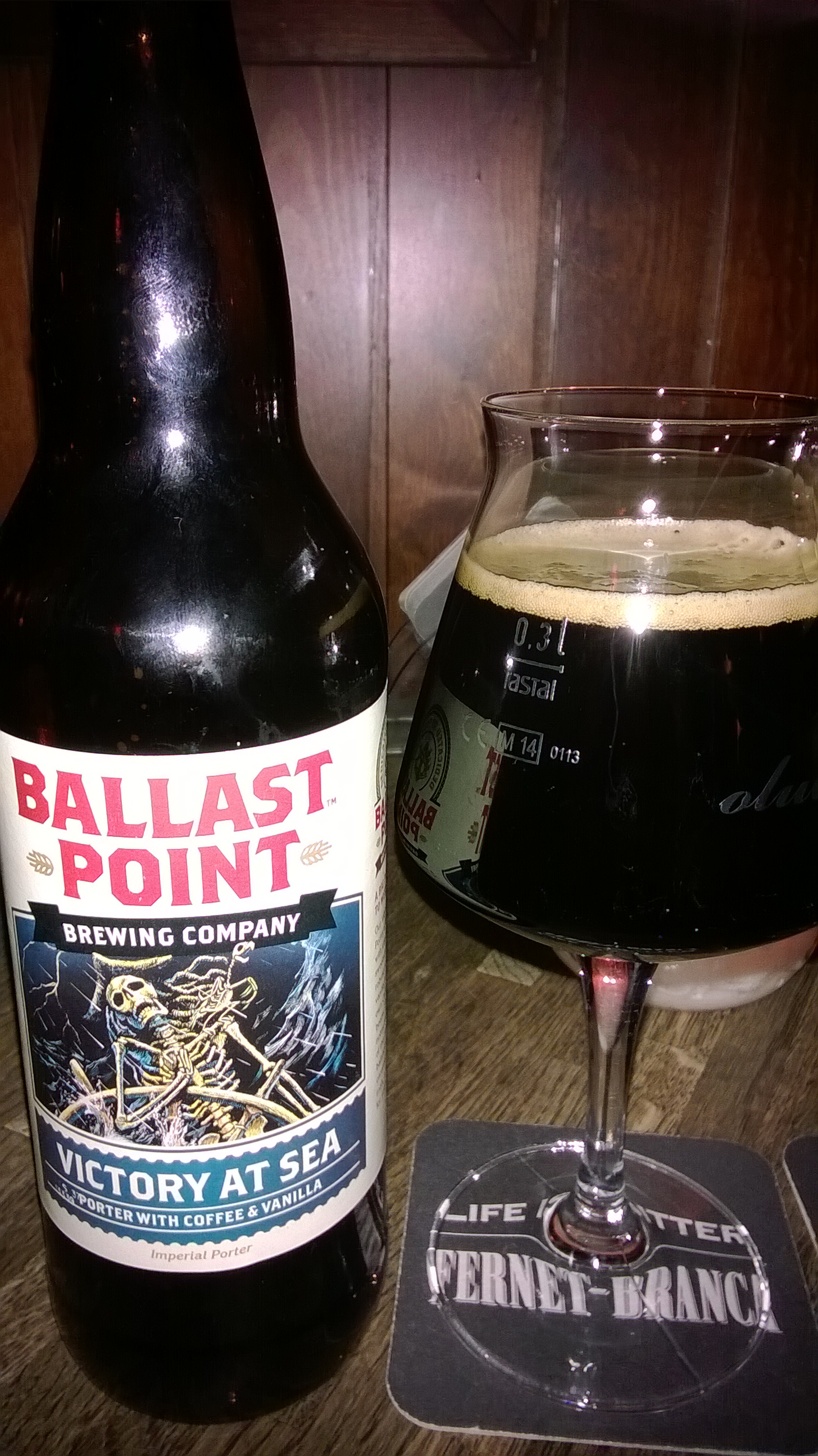 Elokuvan (joka muuten oli Sin City: A Dame To Kill For, jos joku ei mukanokkelasta tittelistä sitä päätellyt) ja ruokailun jälkeen siirryimme Kitty’s Public Houseen, jossa aluksi otimme yhdessä pullon Ballast Point Brewing Companyn Victory At Sea -imperial stoutia. Hiukan vikatikki hyvän ja täyttävän aterian jälkeen: vahva ja tuhti imperiali ei oikein ollut sitä mitä nyt haettiin. Tuoksu oli tumman suklainen, kahvinen ja runsaan paahdettu. Maku oli hyvin jyty ja tumma kahvisella tavalla. Alkoholi maistui läpi liikaakin ja antoi hiukan epämiellyttävääkin terävyyttä makuun. Kahvinen kuivuus, alkoholin suhteellisen vahva maku ja maltainen makeus yhdistyivät välillä tavalla joka toi mieleen barley winen. Pullon lupailemaa vaniljaa mausta ei löytynyt. Totta puhuen teki tiukkaa saada kolmen vartin pullo juotua kahteen pekkaan, sen verran tuhti ja täyteläinen juoma oli kyseessä.