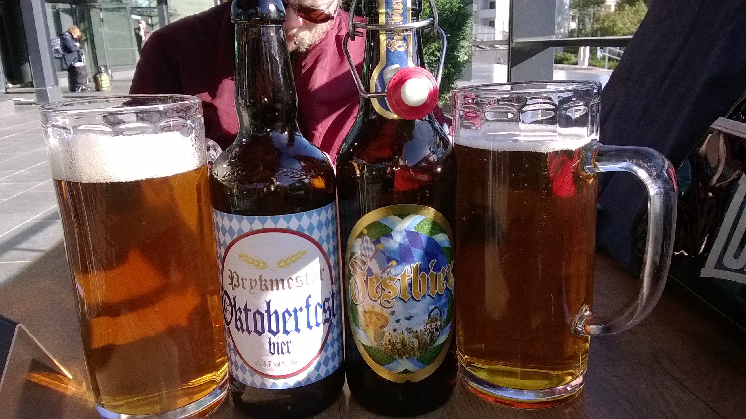 Seuraavana päivänä nautimme vielä Jyväsessä taas pienen muttei kovin kevyen lounaan, jonka yhteydessä perehdyimme Jyväsen Oktoberfest-tarjontaan, joka itse asiassa sisälsi paljon päällekkäisyyksiä Alkon vastaavan kanssa. Myös Alkon valikoimaan kuuluvan Prykmestarin Oktoberfestbier kärsi oudon metallisesta tuoksusta ja mausta, ja oli aavistuksen laimea. Tylsyydestään huolimatta ihan juomakelpoinen olut, joka sopi rasvaisen naposteltavan kanssa hyvin. Pitkälti samaa voi sanoa Saksalaisen pienpanimo Hössin Oktoberfestoluesta, joka ei kärsinyt metallisuudesta mutta oli muuten ehkä piirun verran tylsempi. Mutta eipä Oktoberfestoluet mitään kovin erityisiä yritäkään olla, joten ei niille suuria odotuksia tule kohdistettua. Ihan juotavia molemmat.