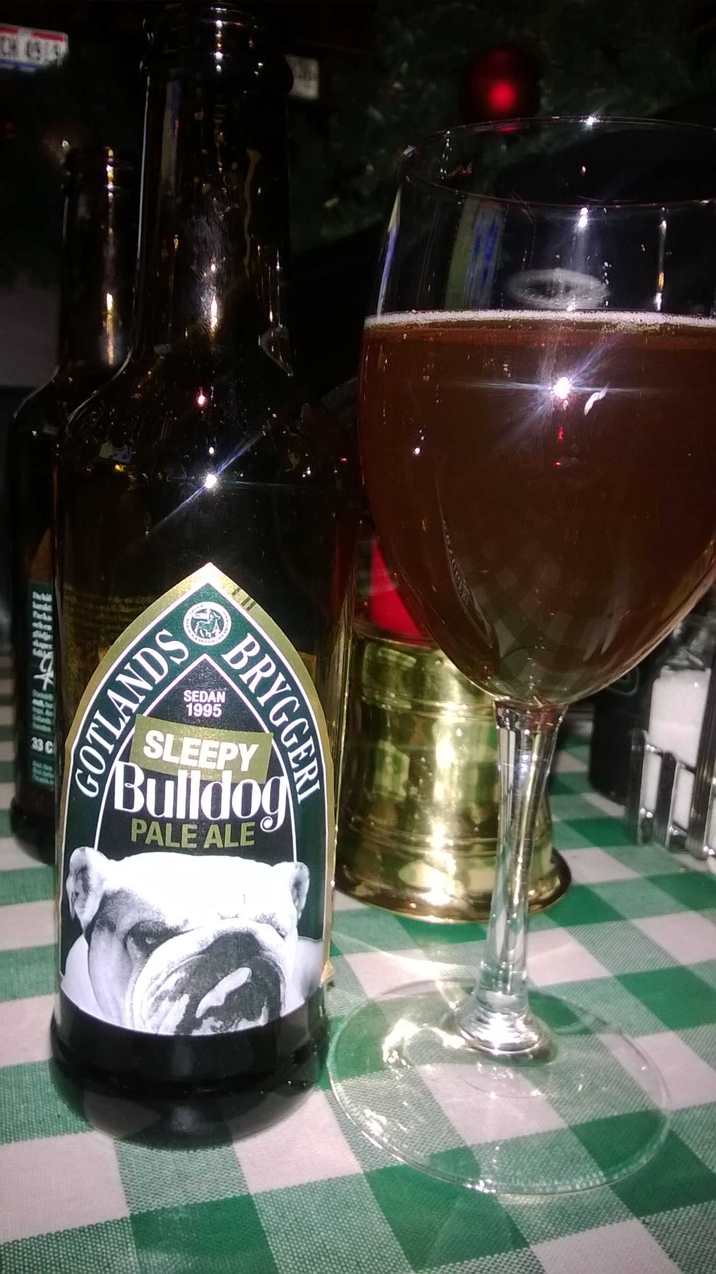 Shoppailun jälkeen siirryimme Forumin O’Learysiin ruokailemaan. Listalla ollut Sierra Nevadan Pale Ale oli loppu, joten tarjoilija suositteli korvikkeeksi Gotlands Bryggerin Sleepy Bulldog Pale Alea saatesanoin ”yhtä hyvää ellei parempaakin”. Aika kova väite! Nätin kuparisen ja jotenkin hedelmäisen oluen tuoksu oli tosiaan hyvinkin Sierra Nevadan valio-oluen kaltainen, joskin siinä oli vähän tökkivä kalainen sivutuoksu. Maussa oli enemmän greippiä kuin Sierra Nevadan loistavan tasapainoisessa oluessa, mutta muuten tosiaan hyvin samantyyppinen olut oli kyseessä. Ei Sierra Nevada Pale Alen voittaaja missään nimessä, mutta silti oikein hyvä olut.