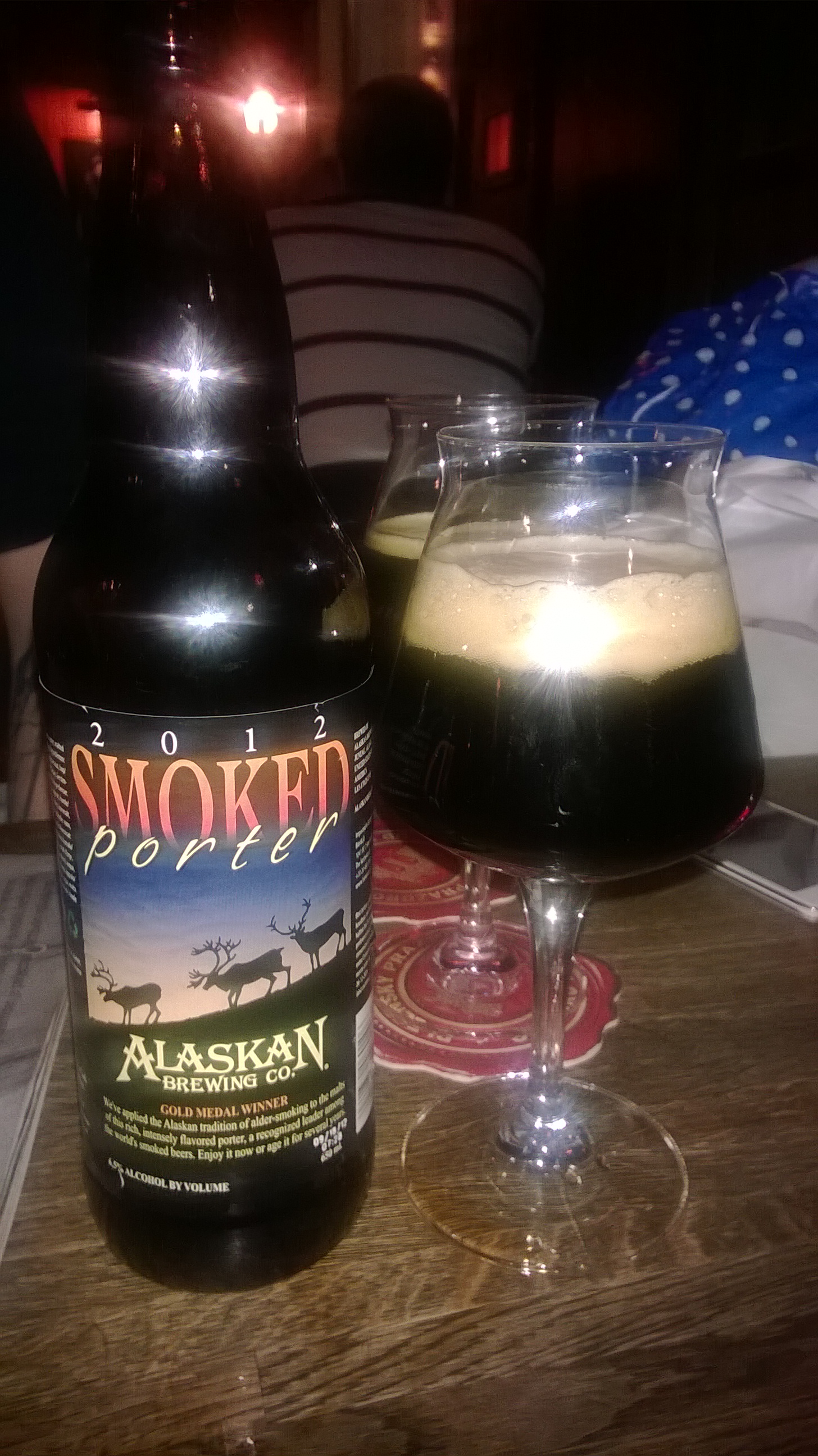 Ruokailun jälkeen siirryimme Kitty’siin kertaamaan päivää, ensin Alaskan Brewing Companyn vuosikertaolut 2012 Smoked Porterin kanssa. Nätisti, kermaisesti vaahtoava yönmusta olut omasi tosiaan maukkaan BBQ:n ja nuotiotulen maun ja tuoksun, mutta ikävä kyllä sen alla ei tapahtunut paljon mitään, ja olut jäikin harmillisen yksiulotteiseksi. Vähän tervaisuutta sisupastillimaisella tavalla pystyi aistimaan, mutta muuten savuisuuden ohella melko tylsä olut. Toisena oluena valitsimme hanasta Morken (ne norjalaiset ö:t…) Pumpernickel Porterin, joka vaahtosi aavistuksen Guinnesmäisesti. Tuoksussa oli makeaa mallaslimppua ja salmiakkisen karkkimaista suolaisuutta. Ihan hyvä olut, mielenkiintoisempi kuin Smoked Porter.