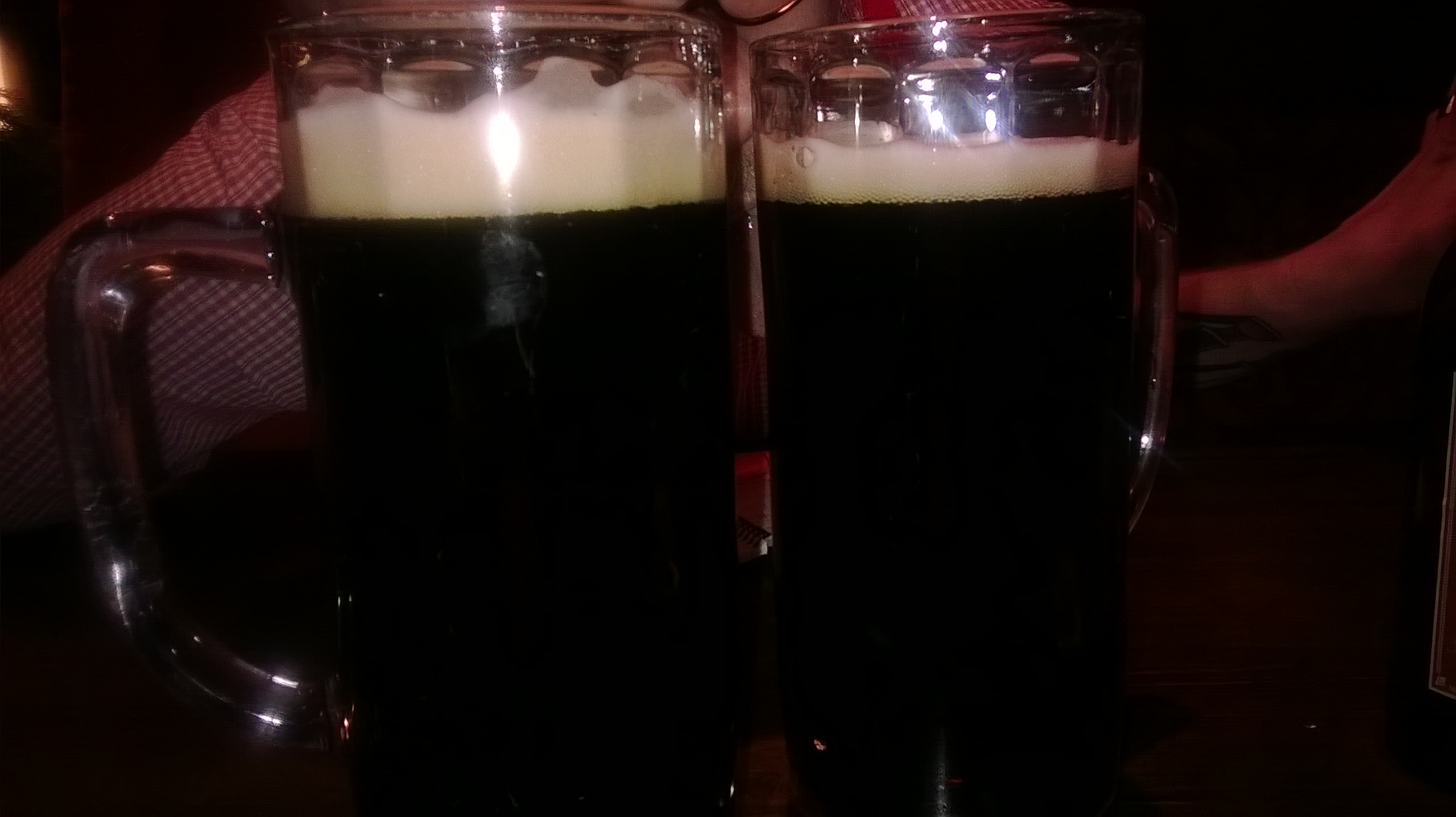 Jälkkärijuomiksi valitsimme perustylsän Guinnessin Draughtin, hanasta, sekä Franziskaner Hefe Dunkelin. Guinness nyt on Guinness, pirun nätin näköinen ja vetisyyden alla samettisen ja paahteisen tumma maku on hyvää… mutta siinä on tosiaan se vetisyys. Hiivatumma eli Hefe Dunkel on maultaan aivan selvästi vehnäolut: ylikypsää, tummunutta banaania, ja kiitos hiivaisuuden melko tunkkainen; ei valittamista!