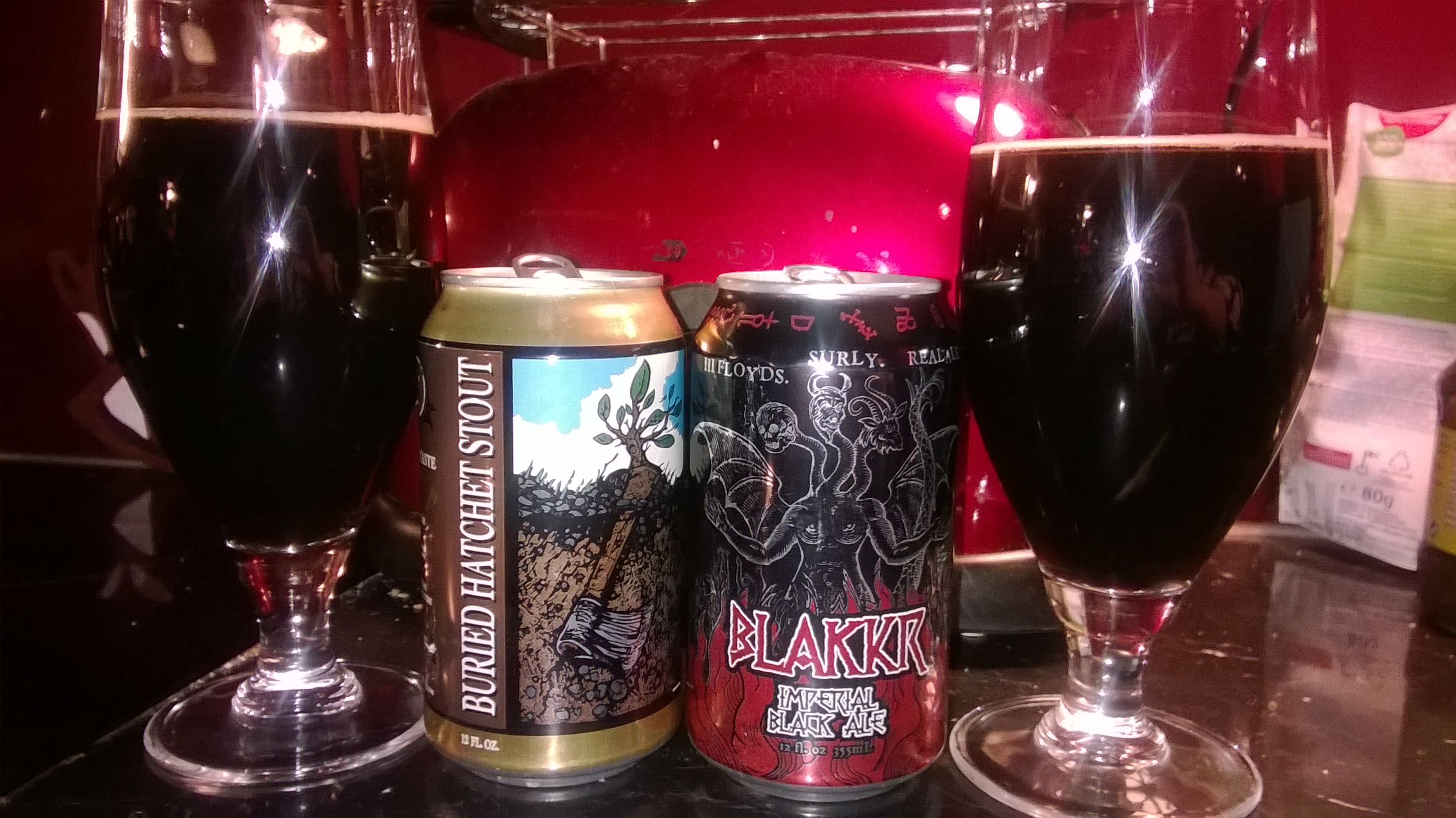 Lisää Texasin ihmeitä vuorossa loppiaisen aattona, tällä kertaa tölkeistä. Blakkr on kolmen panimon yhteistuotos (tämä tölkki Real Ale Brewing Co.:n tölkittämänä), joka on teemaltaan hyvin heavy ellei jopa black metalmainen, nimikin jo viittaa tuohon kauniiseen ja tunneherkkään viemäriörinän genreen. Vahvuus on invertoitu 666 eli 9,99% ja tumman tölkin kyljessä on kolmipäinen demoni ja mystisiä okkultistisia merkkejä. Pitääpä kaivaa kirjahyllystä Pekka Siitoimen musta raamattu ja kutsua esiin pari pahaa henkeä tätä juodessa, vaikka toisaalta pahaa henkeä tulee ihan itsestään näin joulun jälkeen. Buried Hatchet Stout on vähemmän tummasävyinen, viittaahan nimikin sotakirveen hautaamiseen. Nimensä puolesta siis, muuten olut on vielä Blakkriakin mustempi tapaus.