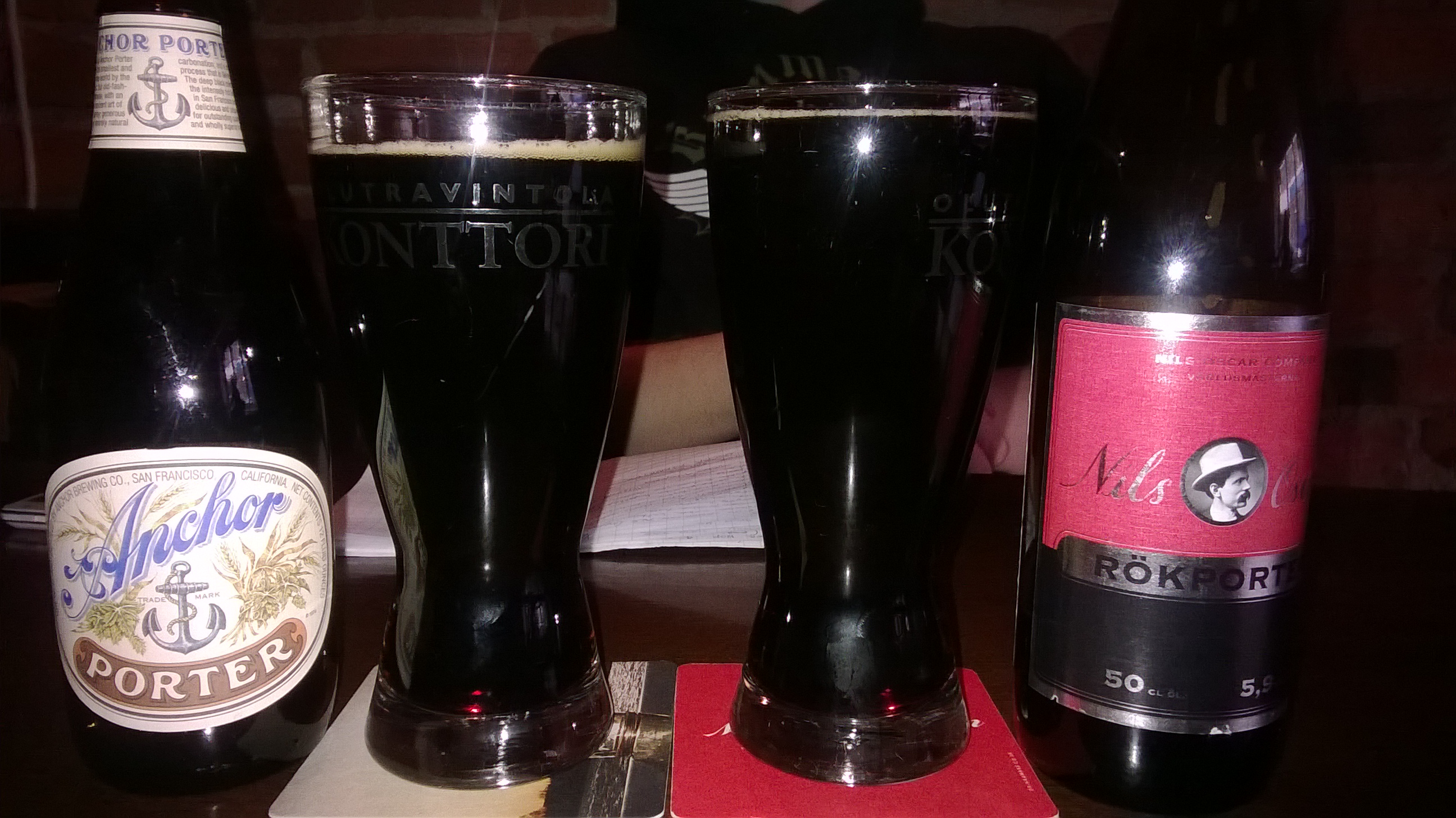 Toisella kierroksella erää ottivat klassikkopanimo Anchorin Anchor Porter sekä ruotsalaisen Nils Oscarin Rökporter. Rökporter oli todellakin savuinen tuoksultaan, sekä paahteinen ja tervainen, mutta maltillisella tavalla. Maussakin oli reilusti savua, mutta kokonaisuutena silti aika pehmeä. Savussa oli pientä Schlenkerlamaisuutta, eikä maku savun alla ollut erityisen paahtunut: makunsa puolesta enemmän savuolut kuin porter siis, ehkä? Pidemmän päälle savuisuus rupesi kuitenkin vähän tökkimään, mitä ei Schlenkerlan tapauksessa tapahdu! Anchorin tumma oli tuoksultaan aika mieto, suklainen ja hedelmäinen, nojaten vähän jopa barley winen suuntaan. Maultaan niinikään makean hedelmäinen, mutta suklaisuuden sijasta maltainen ja selvästi barley winemäinen mutta sen verran kevyt, että pysyy juotavuuden rajoissa. Loppujen lopuksi Nils Oscar vei voiton.