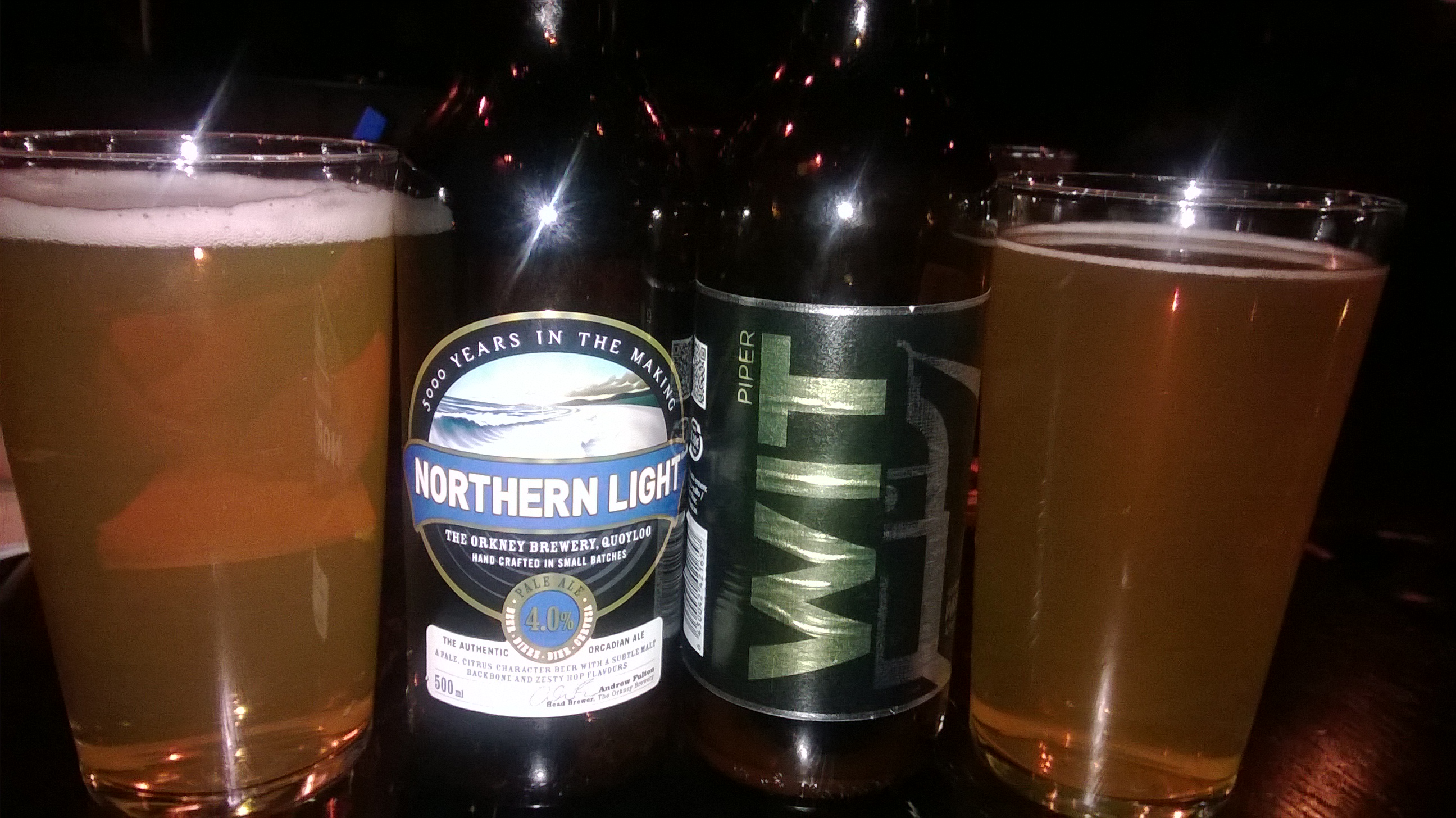 Lauantaina ruokailun yhteydessä nautimme Suomenlinnan Panimon Piper Witin, belgityylisen vehnäoluen, sekä Orkney Breweryn Northern Lights -pale alen. Piper Wit oli tuoksultaan todella kukkainen ja jopa hajuvesimäinen mutta keinotekoisen esanssimainen oudon epämiellyttävällä tavalla. Maku appelsiinimehumainen, rasvainen, kukkainen, kevyt, kevyen mausteinen (korianteria, pomeranssia, appelsiinia), eikä loppujen lopuksi erityisen hyvä. Northern Lights puolestaan oli tuoksultaan todella mieto, hiivainen ja tyypillisen brittiläinen ale. Maku seurasi samoja askelmerkkejä: makeaa mallasta, puumaista humalaa, kevyt ja hiukan imelä. Ei tämäkään mikään täysosuma ollut ja rupesi tuopin loppua kohti tökkimään.