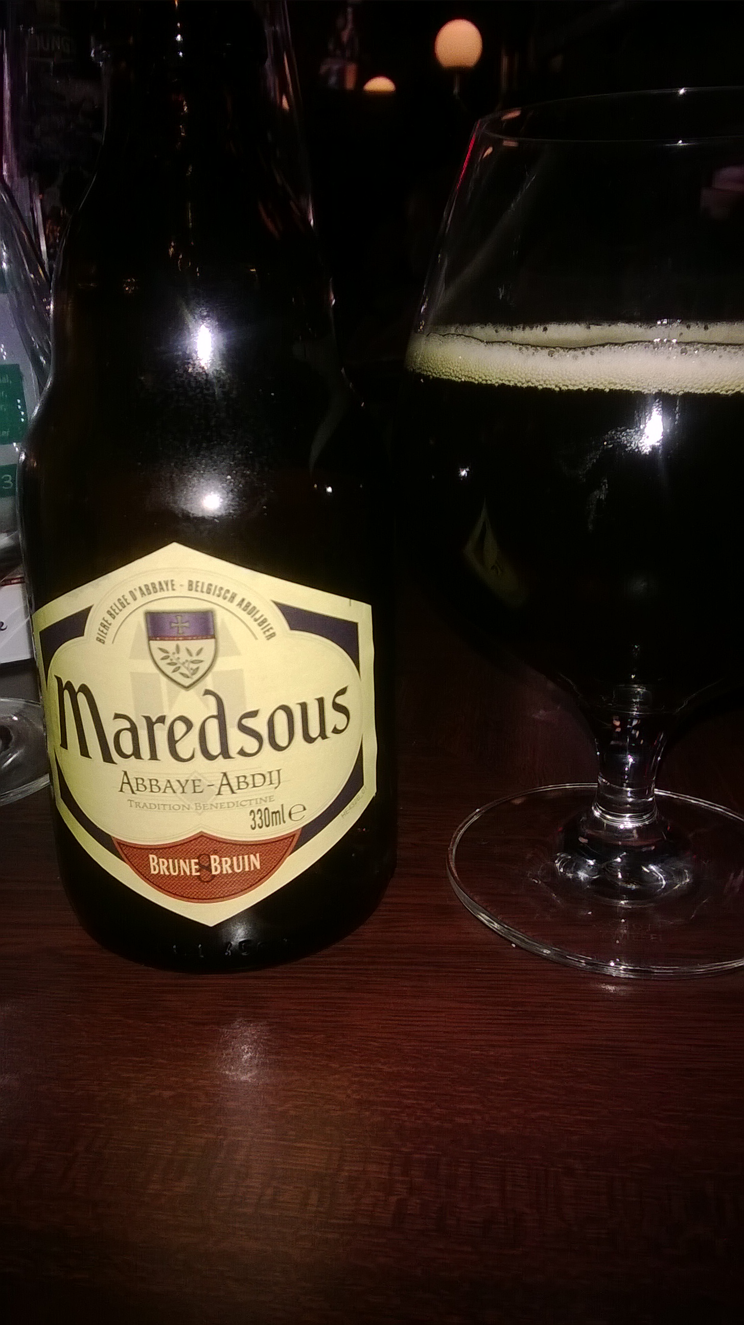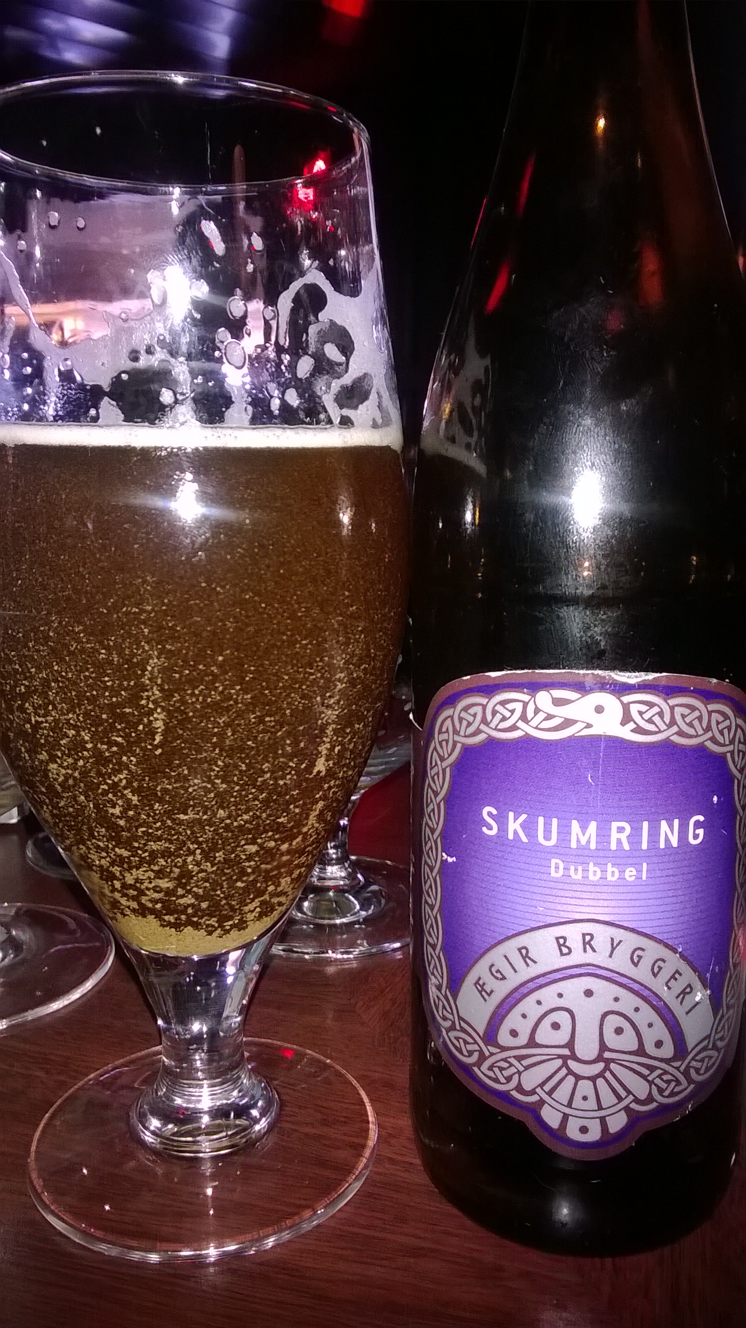Seuraavaksi suunnattiin tummille vesille ja ulkomaille: Maredsousin tumma belgidubbel 8⁰ Brune, sekä norjalaisen Aegirin Skumring Dubbel. Kotikenttäedun omaavan belgialaisen Maredsousin dubbelissa tuoksui siirappimainen tahmea ylimakeus ja tumman hedelmäinen, luumumainen tuoksu. Tuhti tuoksu ei jättänyt arvailun varaa: belgidubbeli tämä on pakko olla. Maku oli samaa sarjaa: vaativan tahmaisen makea, turpean hedelmäinen ja äitelä olut oli ehtaan belgityyliin vaativa. Siltikin Maredsousin brune oli belgityylin tummaksi luostariolueksi ehkä siitä helpommasta päästä. Ehkä hiukan ylisiirappinen meidän pirtaamme, mutta kyllä se mukisematta tuli juotua. Norjalaisten dubbel oli taas tuoksultaan soraisen pähkinäinen sekä leipäinen, ja dubbeliksi ohuenpuoleinen. Maussakin oli pikemminkin mallasleipää kuin esim. Maredsousin siirappista luumua, ja belgityylin tummaksi Skumring olikin ehkä liiankin kevyt, ja toisaalta maku flirttaili vähän liikaa barley winen suuntaan. Maredsous peittosi melko selkeästi Aegirin.